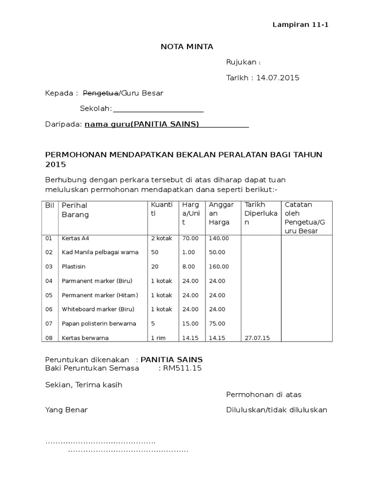 Permohonan mendapatkan bekalan peralatan bagi tahun 2012. Nota Minta Sekolah - Contoh Nota Minta Sekolah - Nov 23 2021 hal itu membuat evaluasi total untuk rehab sekolah tersebut merupakan keharusan. 3 rujukan pesanan asal no.